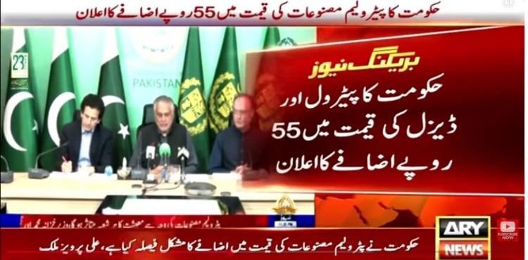 Speaking at a press conference in Islamabad, federal ministers have announced an increase of Rs. 55 per litre in the prices of petrol and diesel.