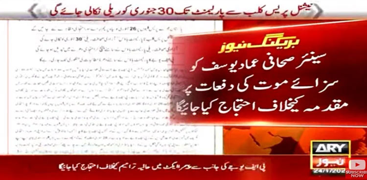 According to a statement, the PFUJ has announced nationwide protest movement against the imposition of death penalty provisions on head of news ARY NEWS Ammad Yousaf, ‘illegal notices’ to TV channels and registration of ‘bogus cases’ against journalists.