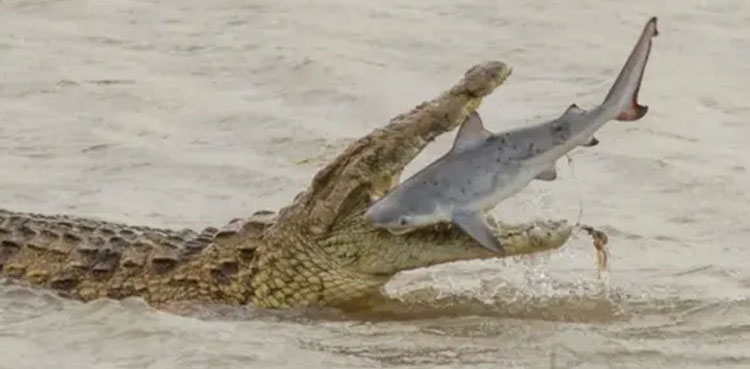 In one of the pictures, the 680-kilogramme Nile crocodile can be seen closing in on the 45-kilogramme bull shark pup with its mouth wide open. Another photo shows the crocodile managing to catch the shark in its jaws.