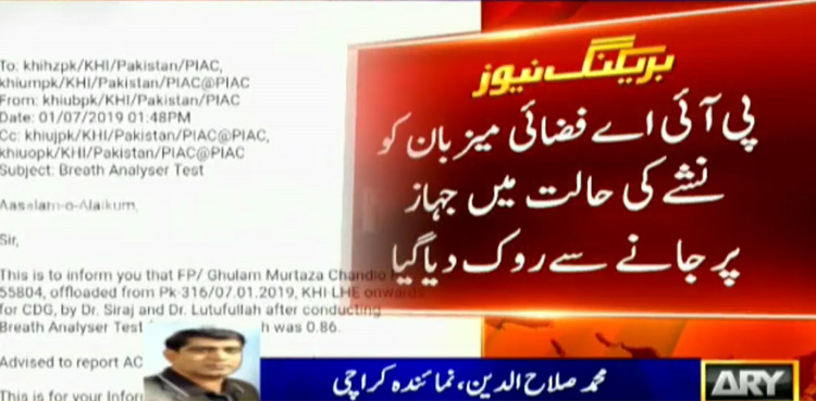 According to PIA officials, flight attendant Ghulam Muhammad Sarwar Chandio was tested positive for alcohol after a medical team paid a surprise visit to the flight (PK-31) and conducted his blood test. He was subsequently offloaded from the flight.