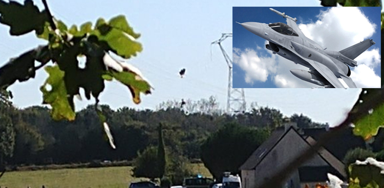 An F-16 jet of the Belgian air force crashed Thursday in western France, with both pilots successfully ejecting but one spending two hours hanging from a power line before being cut down, officials said.