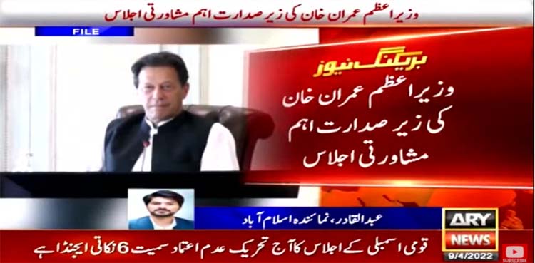 ISLAMABAD: Prime Minister Imran Khan on Saturday chaired a meeting of senior party leaders and legal experts ahead of a National Assembly session for vote on no-confidence motion, ARY NEWS reported.