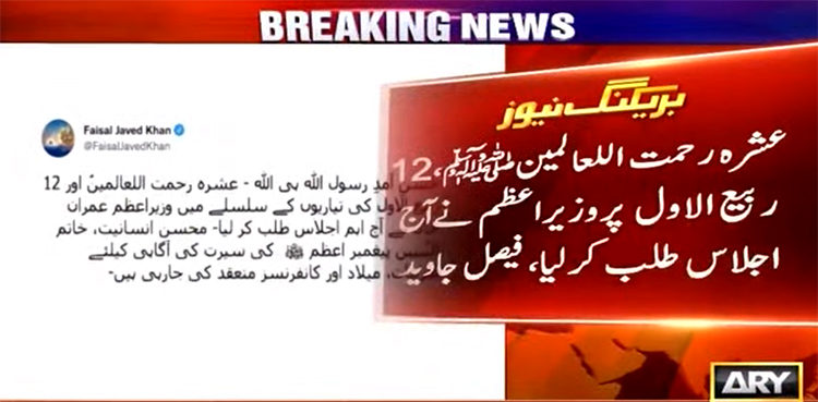 ISLAMABAD: Prime Minister Imran Khan has Wednesday convened a session over preparations and festivities of Ashra e Rehmat ul lil Aalameen (dedicated ten days for recollecting teachings of the Holy Prophet SAWW) and Rabi ul Awal 12, ARY News reported quoting Senator Faisal Javed.