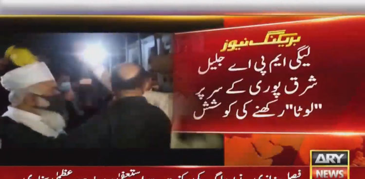 LAHORE: Pakistan Muslim League-Nawaz (PML-N) provincial assembly lawmakers on Friday misbehaved with estranged PML-N MPA Jaleel Ahmed Sharaqpuri and placed ‘lota’ on his head, ARY News reported.
