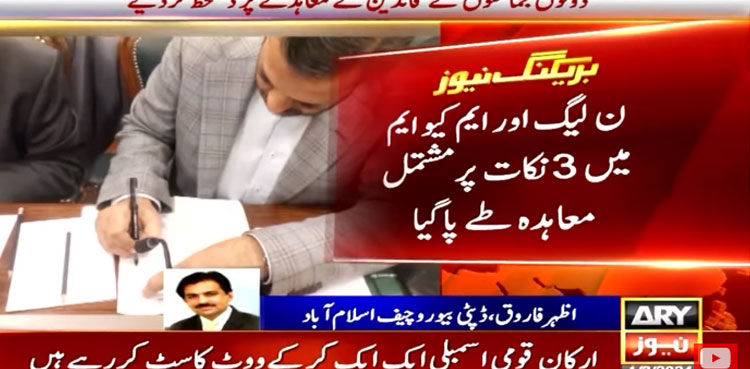 ISLAMABAD: Pakistan Muslim League (PML-N) and Muttahida Quami Movement (MQM-P) have reached a formal agreement over the formation of a coalition government, ARY News reported on Friday.