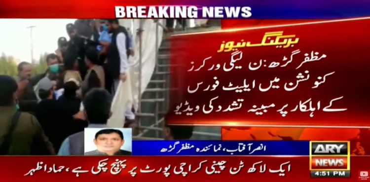 MUZAFFARGARH: A personnel of Punjab Elite Force allegedly manhandled during Pakistan Muslim League-Nawaz (PML-N) workers’ convention in Muzaffargarh, ARY News reported on Friday.