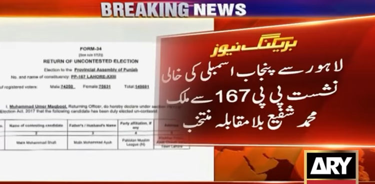 LAHORE: Malik Muhammad Shafi, the candidate for the ruling Pakistan Muslim League-Nawaz (PML-N), has been elected unopposed as a Member of the Provincial Assembly (MPA) for PP-167, ARY News reported.