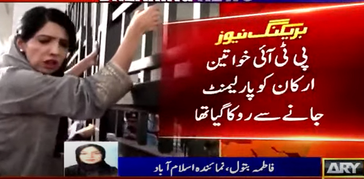 Earlier in the day, PTI’s women lawmakers staged a protest outside the Parliament House after being barred from entering the premises.