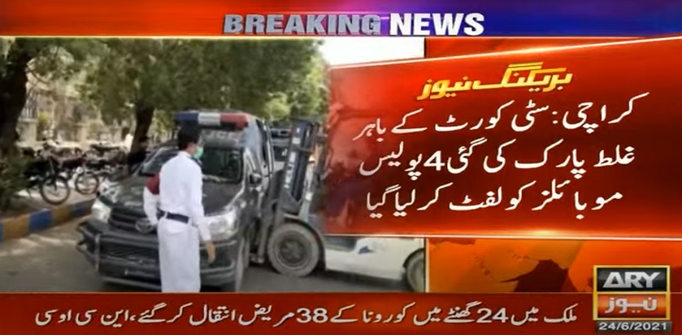 KARACHI: Traffic police in Karachi on Thursday towed away four police mobiles for violating traffic laws at Karachi’s M.A Jinnah Road, ARY News reported.