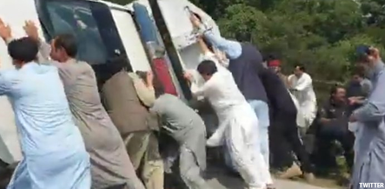 A police van in Amir Muqam’s convoy overturned in Swat in which several cops sustained injuries. PM’s adviser Muqam came out of his vehicle and helped other people to take out injured cops from the overturned vehicle.