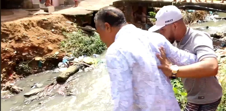 He is seen telling residents that he couldn’t help their community because there were too many things that needed doing elsewhere. Angry residents are seen booing him, and then he is pushed into the sewer he had promised to improve.