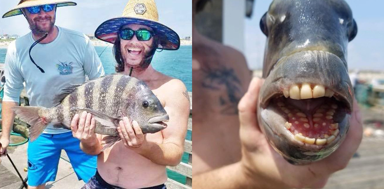 The pictures were posted on Facebook by Jennette’s Pier that showed the unusual fish having teeth on the bottom and top of its mouth. The post read that fisherman Nathan Martin caught the “nice toothy 9 lb” sheepshead fish. The fish has several rows of molars in its mouth used for crushing oysters and other prey.
