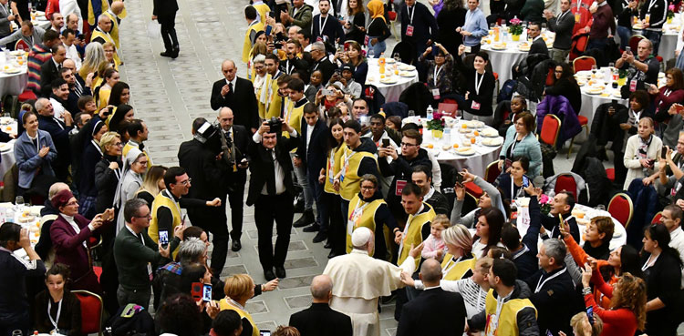 The pope then joined his 1,500 guests for lunch in the Vatican’s vast Paul VI Hall.
