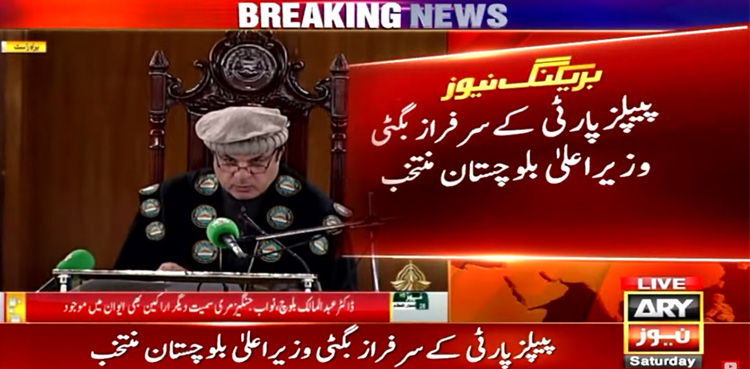 QUETTA: Pakistan People’s Party (PPP) candidate Mir Sarfraz Bugti has been elected as Chief Minister (CM) of Balochistan, ARY News reported.