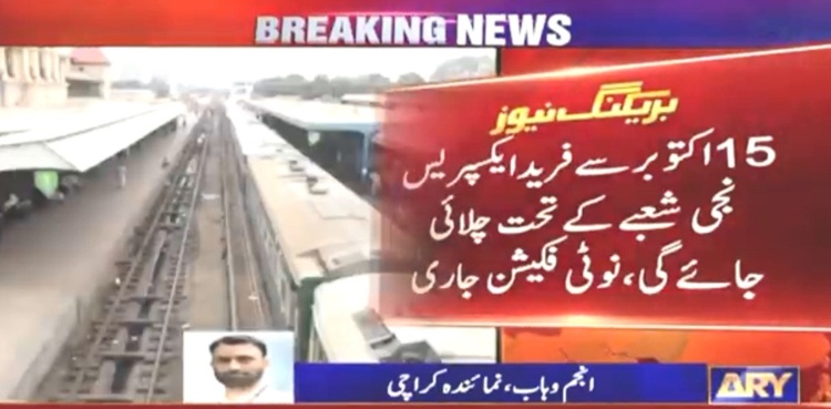 According to a notification issued by the PR, Fareed Express, running from Karachi to Lahore via Pakpattan, has been handed over to the private sector.