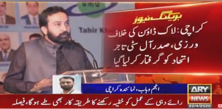 KARACHI: President All City Tajir Ittehad was taken under arrest by local police on Wednesday over allegations of defying coronavirus lockdown restrictions, ARY News reported.