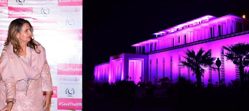 In a ceremony held at president house, Begum Samina Alvi pushed the button to illuminate the building in pink colour, thus marking a charity’s breast cancer awareness drive.