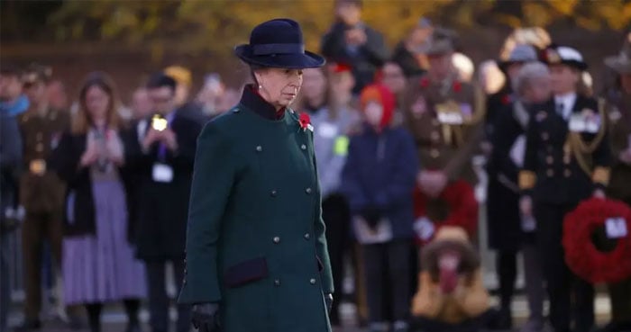 Dressed in an elegant emerald green tailored coat, structured hat and black gloves, Princess Anne stood out against the subdued dawn light as she joined dignitaries, military personnel and members of the public gathered in quiet reflection. A red poppy pinned to her lapel served as a visible symbol of remembrance.
