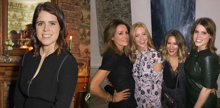 The image shows Eugenie standing alongside Pinkham, Sky News presenter Sarah-Jane Mee and the late television host Caroline Flack. Eugenie and her friends were dressed in black outfits, with Mee wearing a black-and-white floral dress.