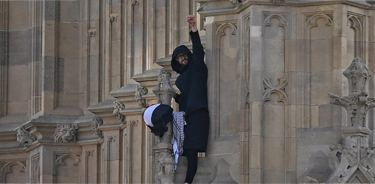 LONDON: In a dramatic protest, a protester holding the Palestinian flag climbed the iconic Big Ben tower at the Palace of Westminster in London on Saturday.