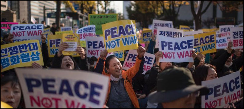 “We oppose war! Negotiate peace!” the protesters chanted in central Seoul, waving banners and balloons emblazoned “Peace, not war” and “We want peace”.