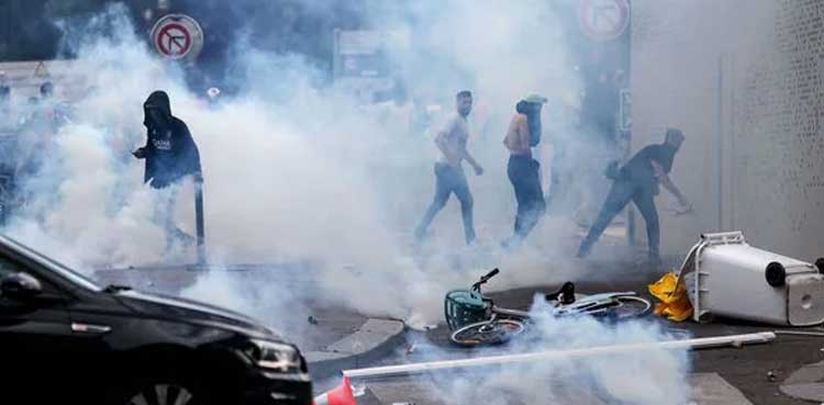 On the boutique-lined Champs Elysees avenue, bus shelters were smashed and projectiles hurled at riot police, who fired tear gas and water cannon to push back surging crowds as thousands of supporters who descended on the area.
