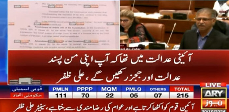 ISLAMABAD: Pakistan Tehreek-e-Insaaf (PTI) Senator Barrister Ali Zafar expressed concerns during a Senate session about the government’s control over the newly “Constitutional Bench,” claiming it allows the government to place its own judges in critical judicial positions, ARY News reported on Sunday.