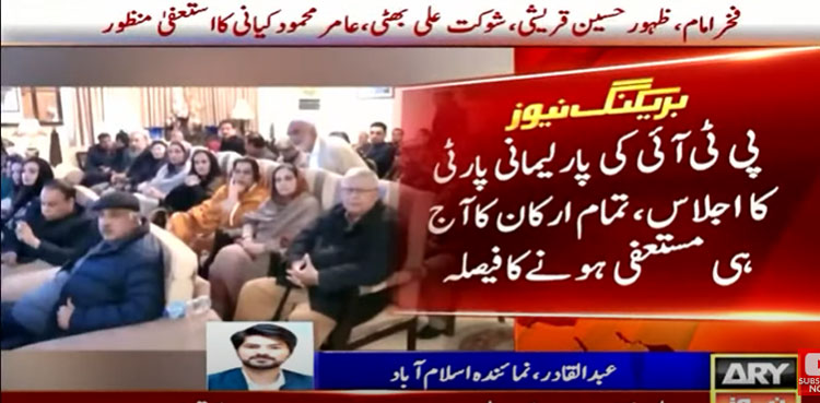 The PTI delegation headed by former federal minister Shah Mehmood Qureshi reached National Assembly Speaker Raja Pervez Ashraf’s chamber to confirm resignations.