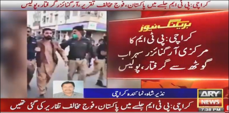 KARACHI: Police on Friday arrested a central organizer of the Pashtun Tahafuz Movement (PTM) from Sohrab Goth area of the city over speeches against Pakistan Army, ARY NEWS reported.
