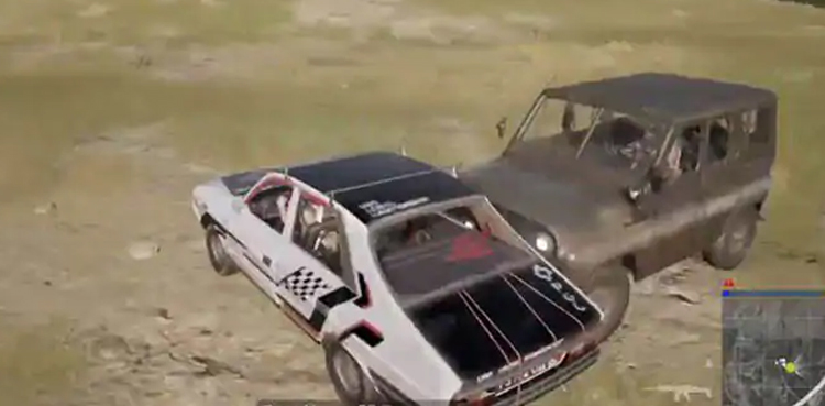 Exposing glitches in the game, the user zoomed around in a Dacia on Erangel map and spotted an enemy on the ground crouching and goes in to run him over with the car.