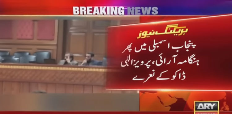 According to details, the Punjab Assembly session – which began after a three-hour delay – witnessed uproar for a second consecutive day with the Opposition lawmakers chanting slogans against CM Pervaiz Elahi.