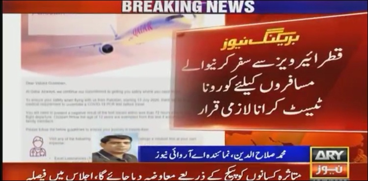 ISLAMABAD: In an effort to prevent the spread of the novel coronavirus, Qatar Airways has issued a new advisory making it mandatory for all the passengers travelling from Pakistan to provide a copy of the test result for COVID-19, ARY News reported.