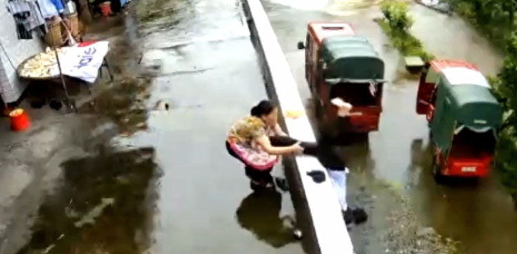 A quick-thinking mother saved her daughter from falling off a building in China.