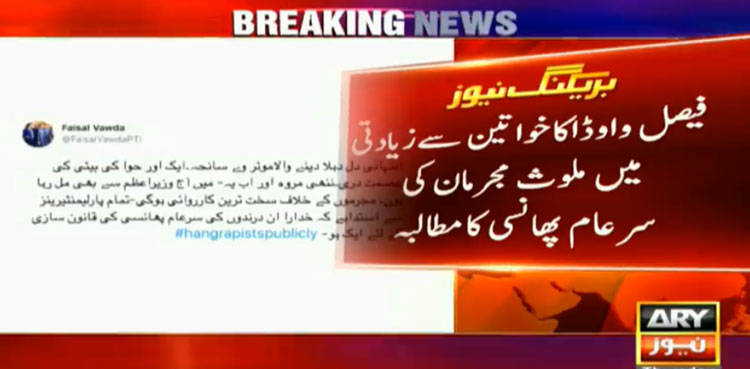 ISLAMABAD: Minister for Water Resources Faisal Vawda on Thursday urged all parliamentarians to join hands to enact legislation that paves the way for public hanging of rapists.