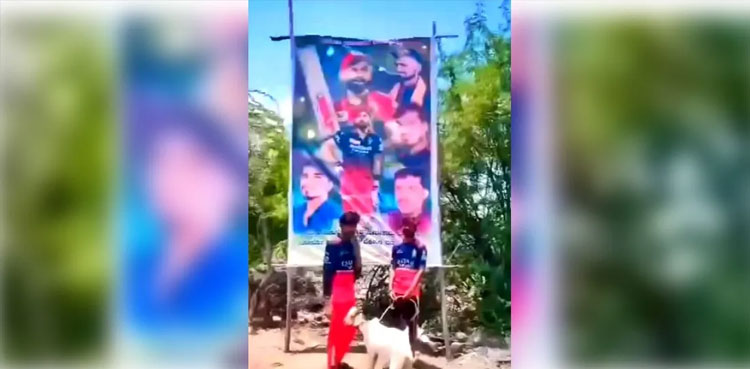 A man is shown in the video holding the goat in front of Virat Kohli’s cutout while another man joyfully declares the RCB’s triumph.