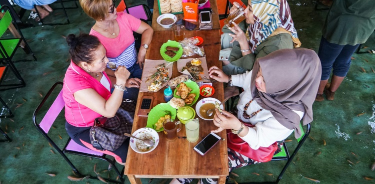 The tables and chairs at Soto Cokro Kembang in Indonesia’s cultural capital Yogyakarta sit in ankle-deep water, home to thousands of little fish that nibble dead skin off the feet of diners.
