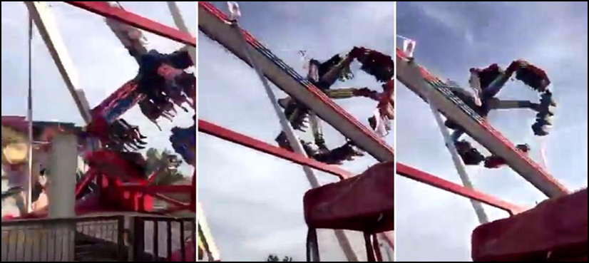 Dramatic video captured by a bystander shows the ride swinging back and forth like a pendulum and spinning in the air when it crashes into something and part of the ride flies off, throwing riders to the ground.