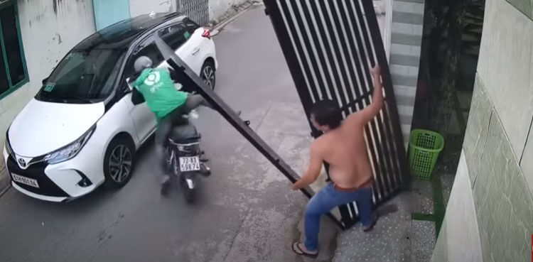 VIETNAM: In a shocking incident, a bike rider narrowly escaped being hit by a falling iron gate when he was passing through an alley in Vietnam.