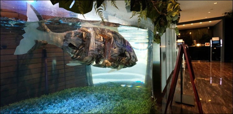 Even the fish swimming in the lobby run on batteries, with electric lights in their articulated bodies flickering on and off as they work their way around giant tanks.