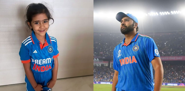 The next picture shows the little one with her back facing the camera, proudly flaunting the number “45” and “Rohit” emblazoned on the jersey.