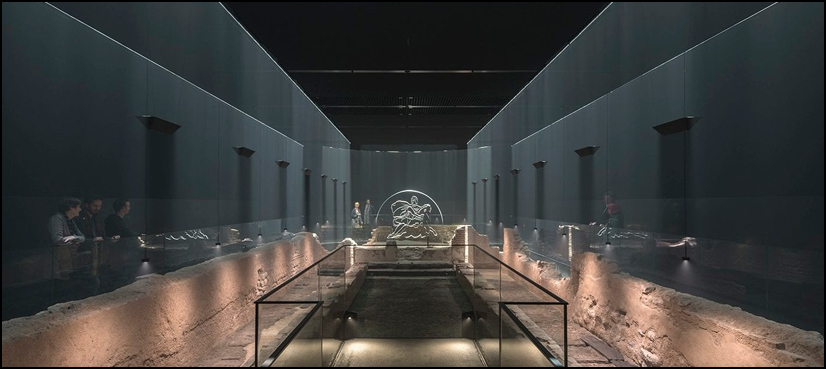 The site is darkly lit and an audio soundscape reveals some of the noises and Latin chatter that visitors to the temple might have heard as Mithras cult members indulged in feasting, drinking and sacrificing.