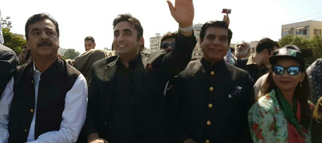 Chief Minister of Sindh Murad Ali Shah, former Prime Ministers Syed Yousuf Raza Gillani and Raja Pervez Ashraf, Khursheed Shah, Sherry Rehman, Nafisa Shah, Latif Khosa, Qaim Ali Shah, Shehla Raza and Moula Bux Chandio are accompanying the PPP chairman who was perched on the top of a bus.