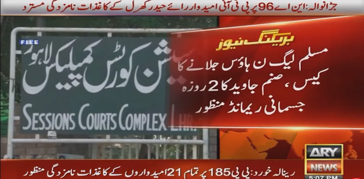 LAHORE: Pakistan Tehreek-e-Insaf (PTI) activist Sanam Javed has been sent on two-day physical remand in a case pertaining to attack on PML-N house, ARY News reported.