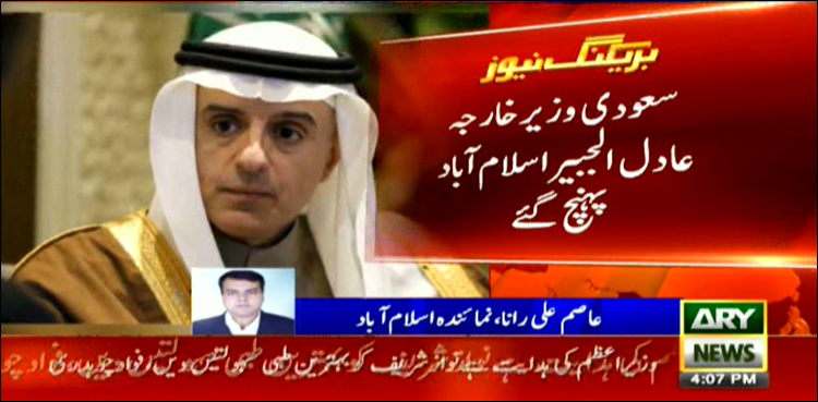 ISLAMABAD: Saudi Arabia’s Minister of State for Foreign Affairs Adel Al-Jubeir has touched down in Islamabad on a daylong visit, ARY News reported on Thursday.