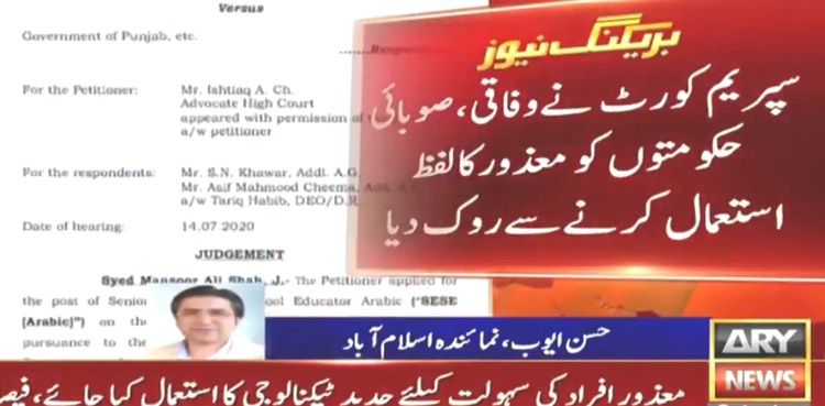 ISLAMABAD: The Supreme Court of Pakistan (SC) has directed federal government and provinces to discontinue using “disabled,” “physically handicapped” and “mentally retarded” words for persons with different abilities, ARY News reported.