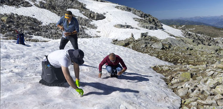 “These algae are green. But when it’s in the snow, it accumulates a little pigment like sunscreen to protect itself,” said Marechal, research director at Grenoble’s Scientific Research National Center, who was collecting laboratory samples on Le Brevent mountain with teammates.