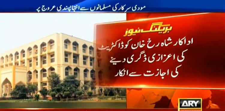 NEW DELHI: India’s Ministry of Human Resources Development (HRD) has rejected a request by Jamia Millia Islamia University Delhi to confer upon Bollywood star Shahrukh Khan an honorary doctorate, ARY News reported.