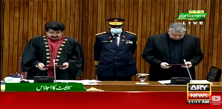 Senate Chairman Sadiq Sanjrani administered oath to the senator-elect at the start of a session of the upper house of Parliament.