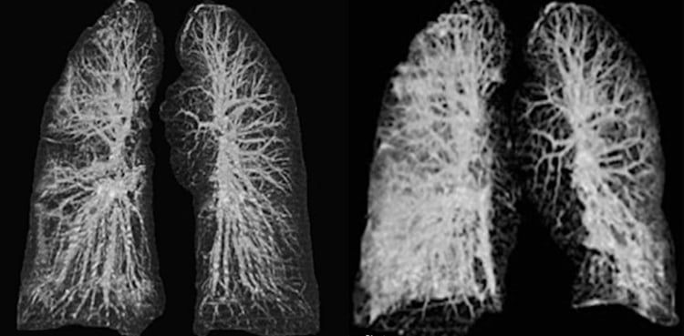The researchers write: “Lung patterns in both patients were characterised by hypertrophy of the pulmonary vessels, which are increased in size, particularly in areas with more pronounced interstitial impairment.