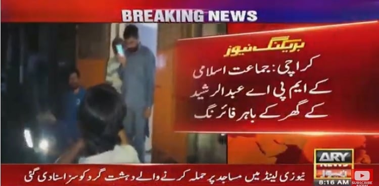 KARACHI: Unidentified gunmen fired shots outside the residence of Jamaat-e-Islami Sindh Assembly MPA Abdul Rasheed in city’s area of Lyari on Thursday, ARY News reported.
